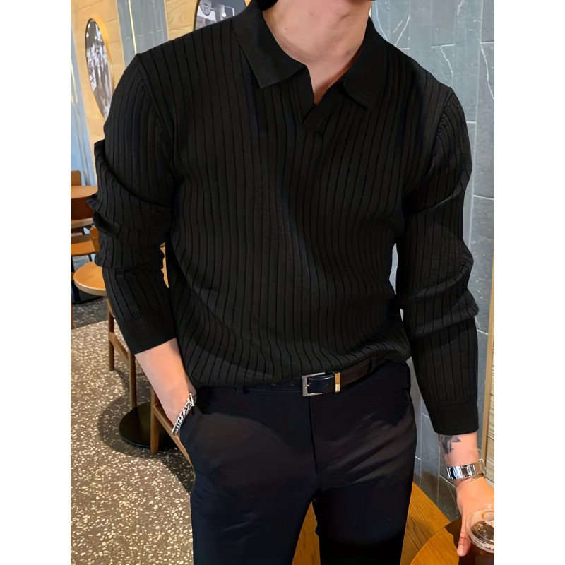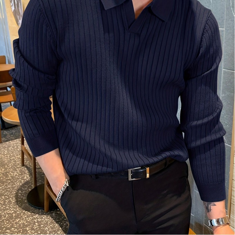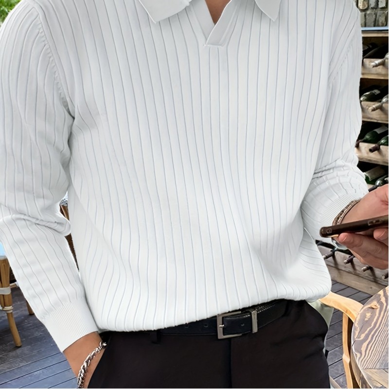 Chic Knit Shirt, Men's Casual Stylish Lapel Middle Stretch V-Neck Pullover Sweater For Winter Autumn