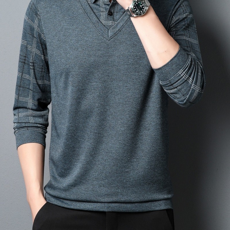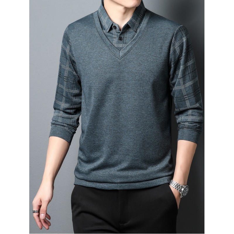 Fake Two-piece Design Preppy Chic Knit Shirt, Men's Casual Lapel Mid Stretch V-Neck Pullover Sweater For Men Winter Fall