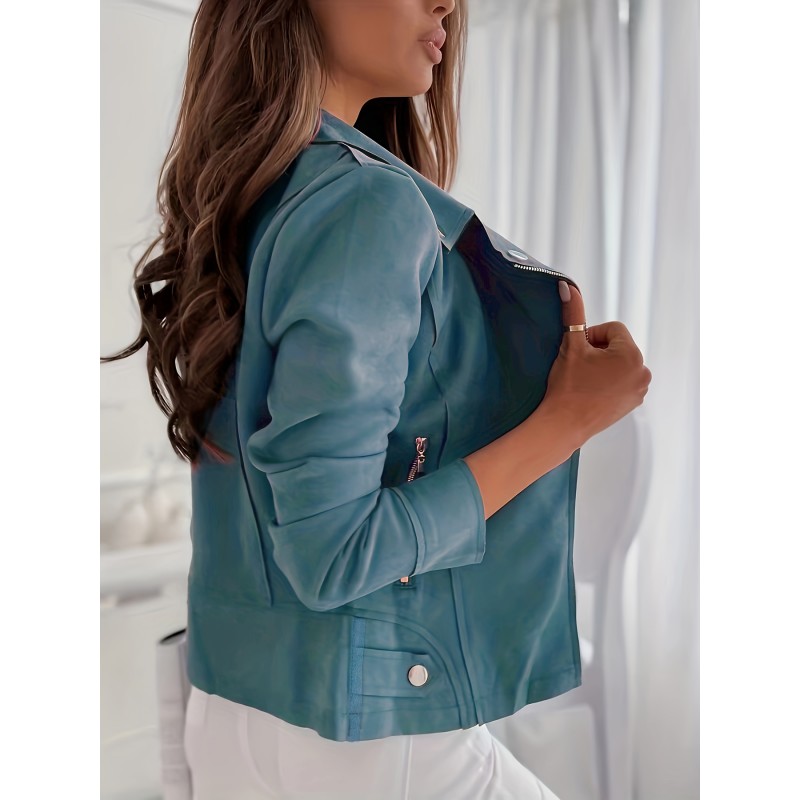 solid zipper biker jacket casual long sleeve waterfall collar outerwear womens clothing details 5