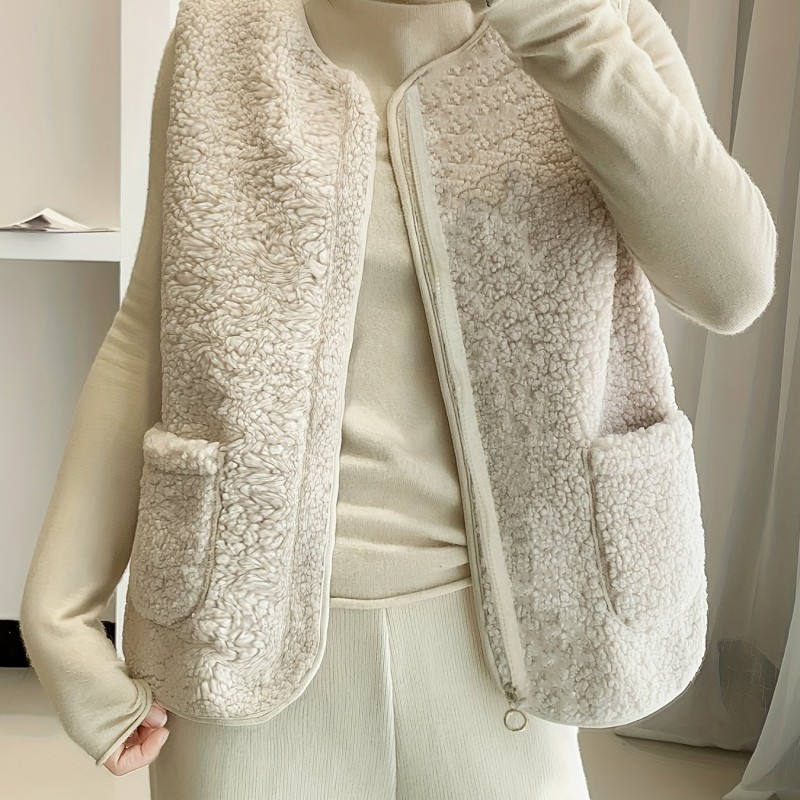 Solid Zipper Patched Pockets Teddy Vest, Versatile Sleeveless Warm Outwear For Fall & Winter, Women's Clothing